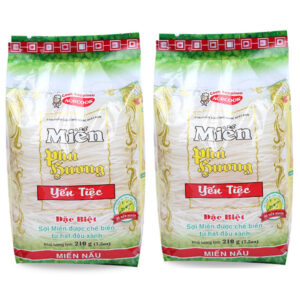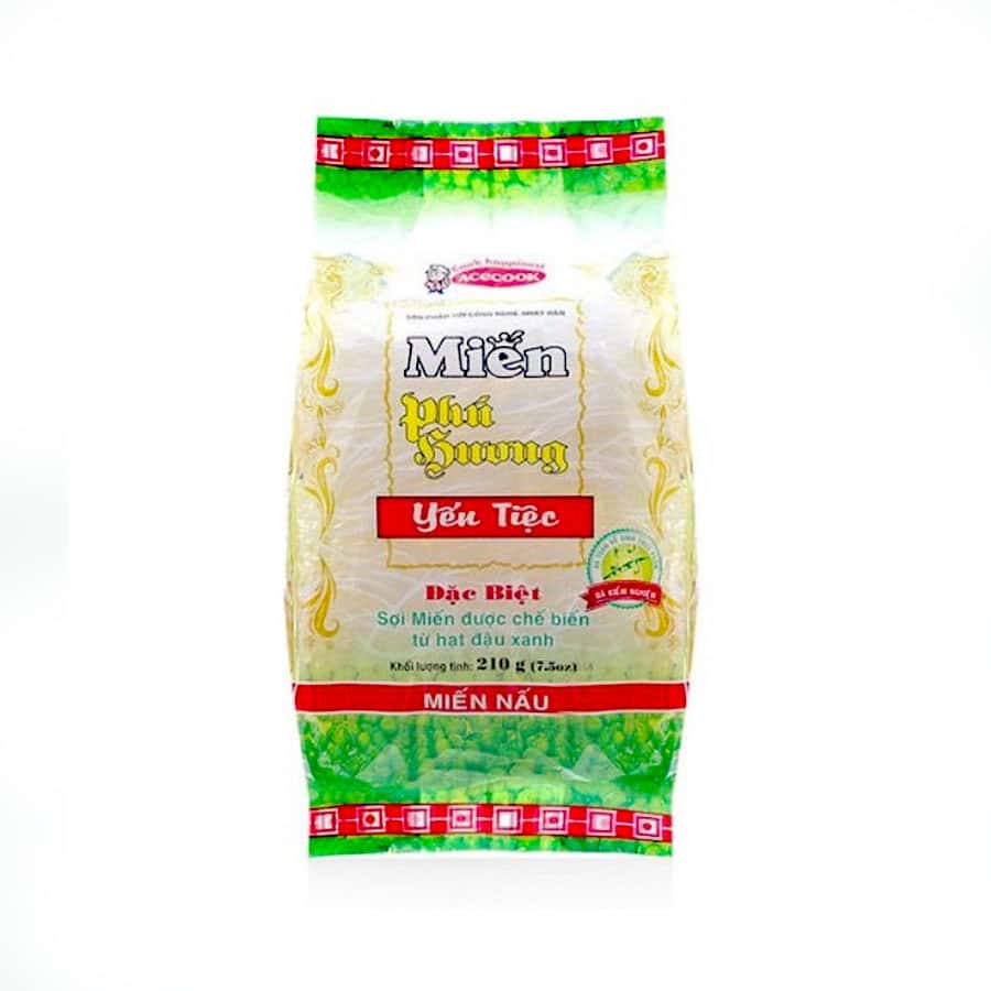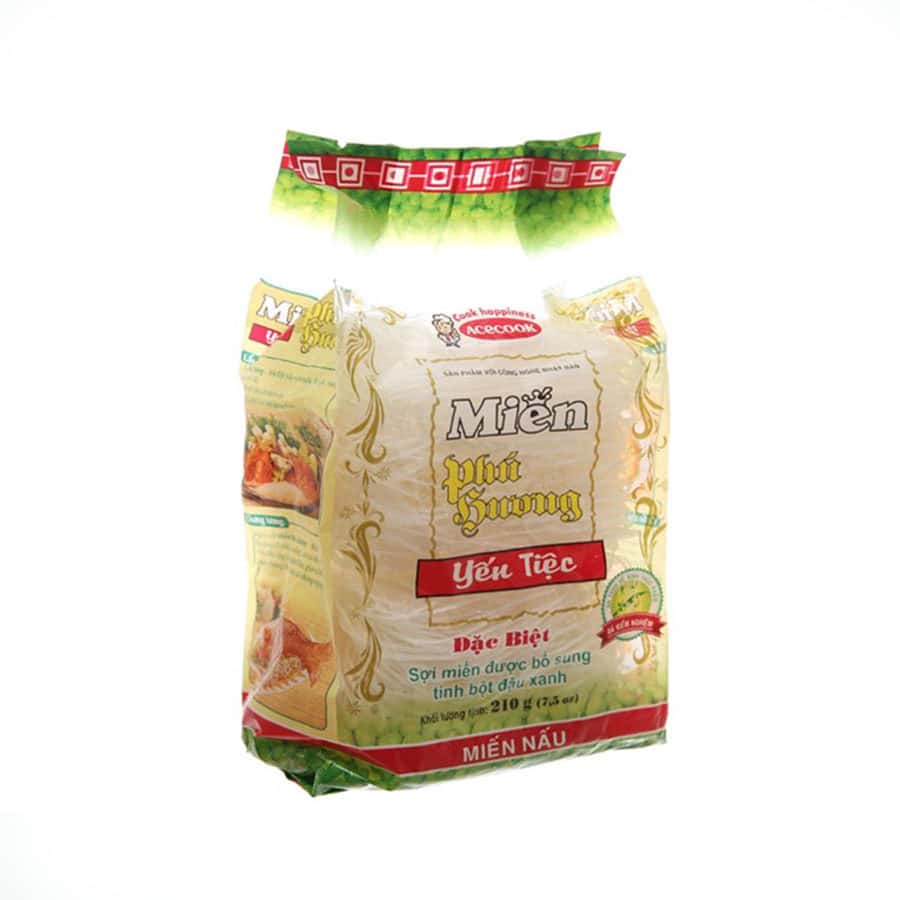 Phu Huong Banquet Vermicelli, 210g pack sợi miến tròn, nhỏ, màu trắng được làm từ bột đậu xanh. Miến đậu xanh Yến tiệc Phú Hương Vina Acecook gói 210g chỉ cần ngâm nước vài phút là có thể nấu theo sở thích của mỗi người. Miến Phú Hương chất lượng, được nhiều chị em nội sợ tin tưởng chọn mua trong căn bếp của nhà mình.
