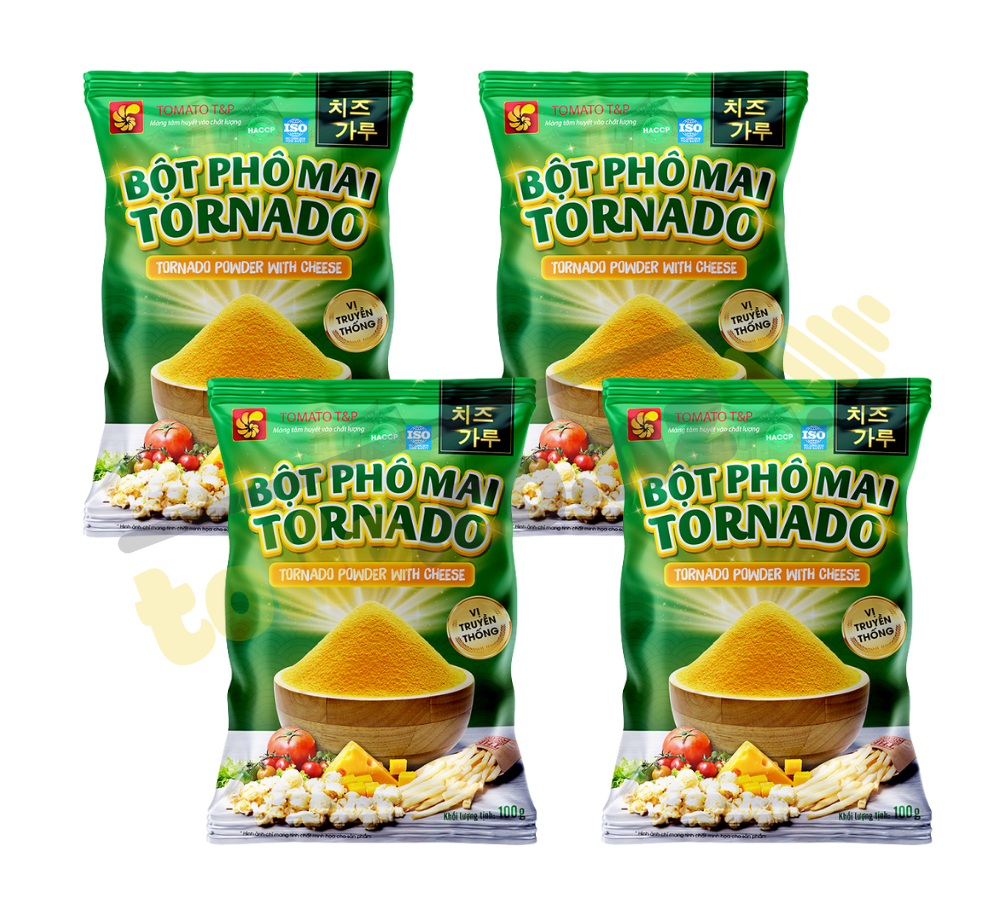Tornado cheese powder traditional flavor 100g Using raw materials imported from Korea and Europe. With high cheese content, Tornado cheese powder has a unique cheese flavor and high nutritional value, more outstanding than similar products on the market. The product can be used directly, can be combined with many convenient dishes, has a price suitable for consumers, and is loved by many children and young people.