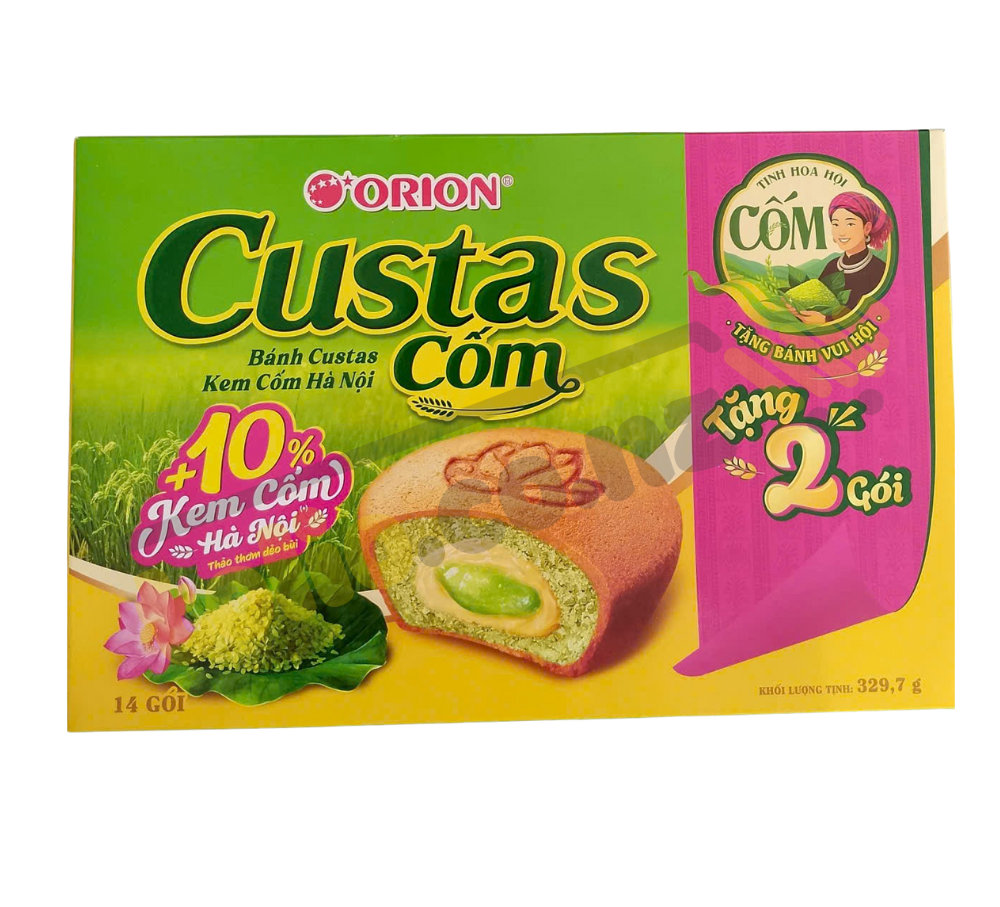 Bánh Custas Orion nhân kem cốm hộp 329.7g Thành phần Trứng (22%), bột mì, đường, dầu thực vật, chất béo thực vật, mạch nha, chất làm ẩm, bột sữa nguyên kem, chất nhũ hóa, bột dừa, bột kem sữa,…với hương vị cốm Hà Nội thơm ngon, lớp ngoài mềm xốp cùng nhân kem béo mịn, được làm từ những nguyên liệu tự nhiên, an toàn cho sức khỏe.