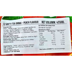 - Trà xanh C2 hương đào 455ml là chiết xuất từ lá trà xanh Thái Nguyên thượng hạng tuyển chọn kỹ lưỡng, sản xuất trên công nghệ hiện đại, quy trình khép kín, đóng chai trong cùng một ngày giúp giữ trọn vẹn giá trị dinh dưỡng của nguyên liệu hồng trà và hương vị của quả đào mọng nước bao gồm chất chống oxy hóa và hàm lượng cao vitamin C