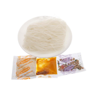 - Cho vắt hủ tiếu, gói súp bột, gói dầu và gói rau sấy vào tô. Chế nước sôi vào khoảng 400 ml, đậy nắp lại và chờ trong 3 phút. Trộn đều và dùng được ngay.