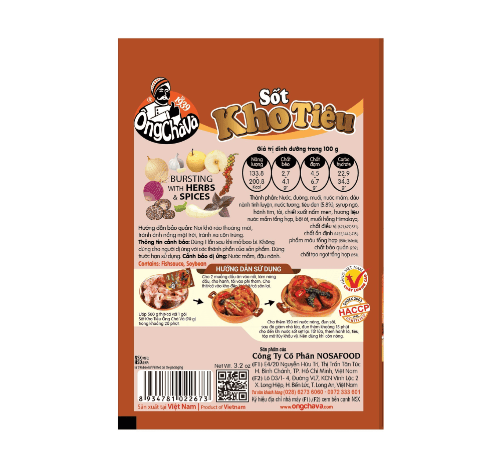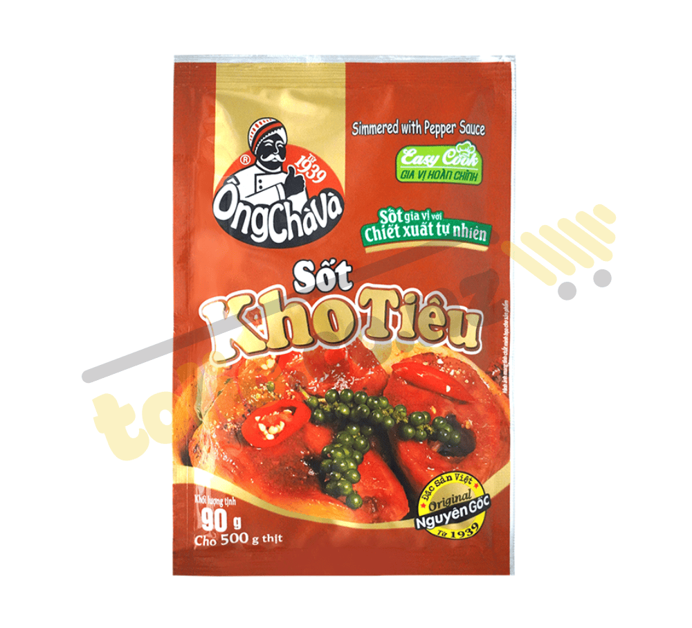 Sốt kho tiêu Ông Chà Và 90g là dòng gia vị tiện lợi cho những ai yêu thích món kho thơm nồng hương tiêu nhưng không có thời gian pha nêm từng loại gia vị. Với tiêu đen 5.8% kết hợp cùng nước mắm, nước tương và hành tỏi phi sẵn, sốt mang lại mùi vị cay nồng dịu nhẹ, hậu vị ngọt và mặn hài hòa. Chỉ cần 1 gói 90gr, bạn có thể kho được 500g thịt hoặc cá, cho ra nồi kho sánh đẹp, thơm ngon đúng kiểu truyền thống – rất phù hợp với bữa cơm gia đình hàng ngày.
