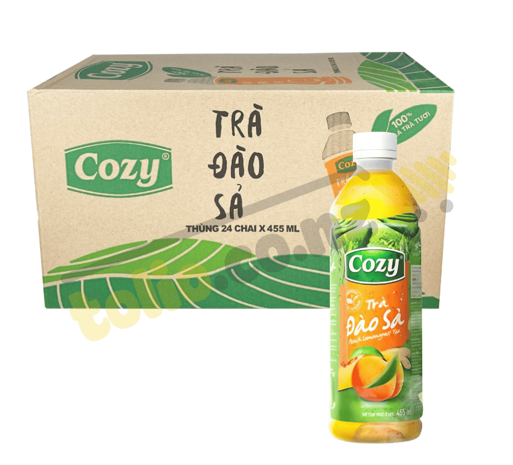 Thùng 24 chai Trà đào sả Cozy 455ml với nguyên liệu chiết xuất từ lá trà xanh chọn lọc kết hợp cùng mật ong nguyên chất, sả và đào tươi thiên nhiên, đem đến vị thơm mát, chua ngọt hòa quyện tự nhiên. Trà đào sả Cozy với thành phần giàu chất chống oxy hóa giúp tăng cường đề kháng và tiếp thêm năng lượng cho cơ thể.