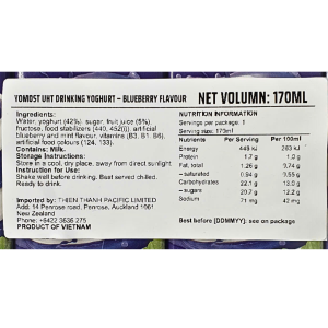 - Sữa chua uống Yomost vị Bạc hà, Việt quất với thành phần gồm: Nước, sữa chua lên men 42%, đường, nước ép trái cây (5%), fructose, chất ổn định, natri polyphosphat (452i), hương việt quất và bạc hà tổng hợp, chất tạo màu tổng hợp dùng cho thực phẩm: ponceau 4R (124) và brilliant blue (133)